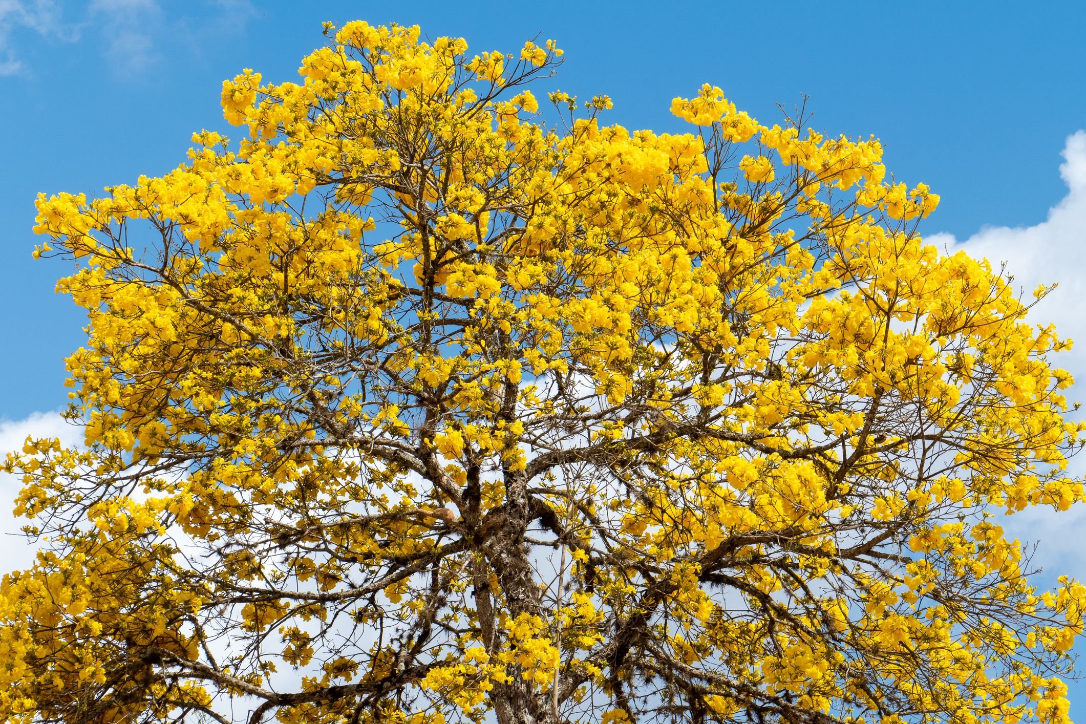 O ipê-amarelo é um clássico! Essa árvore dá flores lindas que decoram tanto o jardim quanto o chão, na época de cair. A planta cresce bastante e faz uma sombra perfeita pros dias mais quentes na beira da piscina.